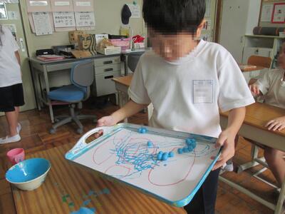 小A3・4年生で担当するすだち祭お店屋さんの準備を進めています。来てくれたお客さんに渡す景品づくりに取り組み、画用紙にスポンジやビー玉でカラフルな模様を付けて、しおり作りを楽しく行うことができました。